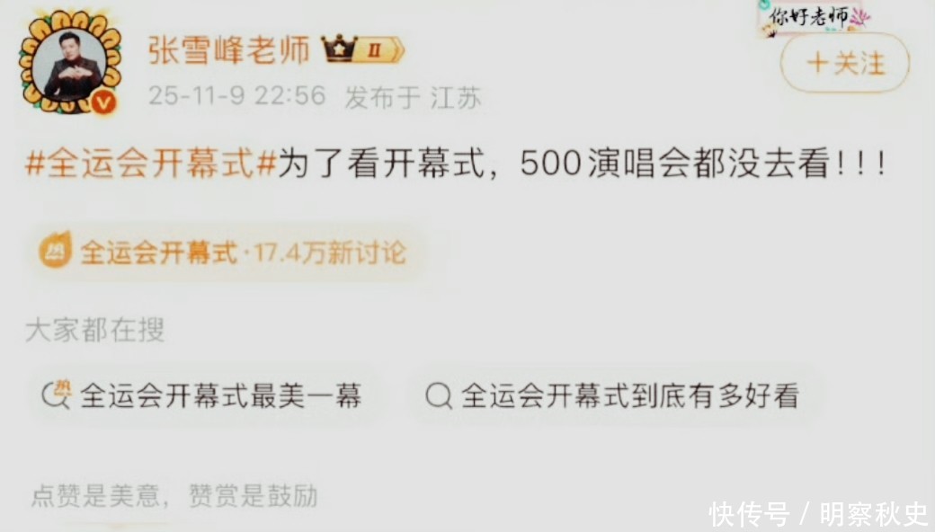 可在当天晚上11点左右,张雪峰却在微博上惋惜自己为了看全运会,错过了伍佰的演唱会。